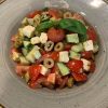 paradicsommal, uborkával, lila hagymával, oregánóval, olívabogyóval, fetasajttal, olívaolajjal meglocsolva