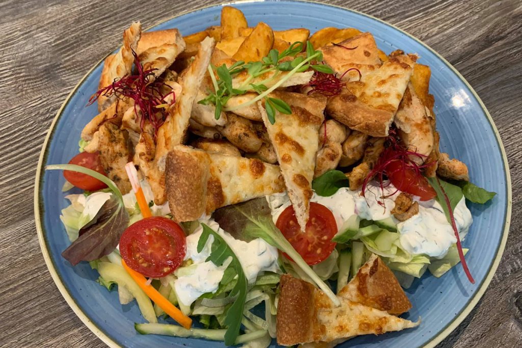 csirke gyros, friss saláta, tzatziki, steakburgonya, házi sajtos kruton