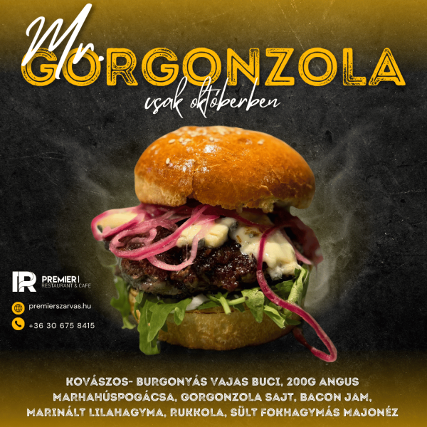kovászos- burgonyás vajas buci, 200g angus marhahúspogácsa, gorgonzola sajt, bacon jam, marinált lilahagyma, rukkola, sült fokhagymás majonéz