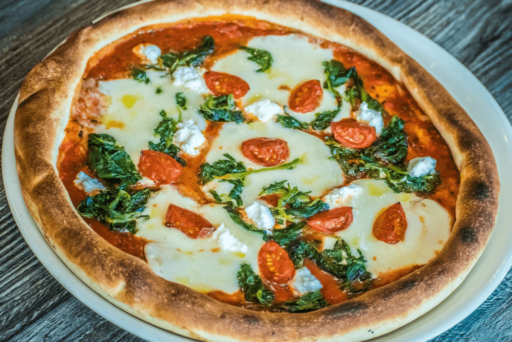 pizzaszósz, mozzarella sajt, ricotta – olasz túró, friss spenót levél, koktél paradicsom, fokhagyma