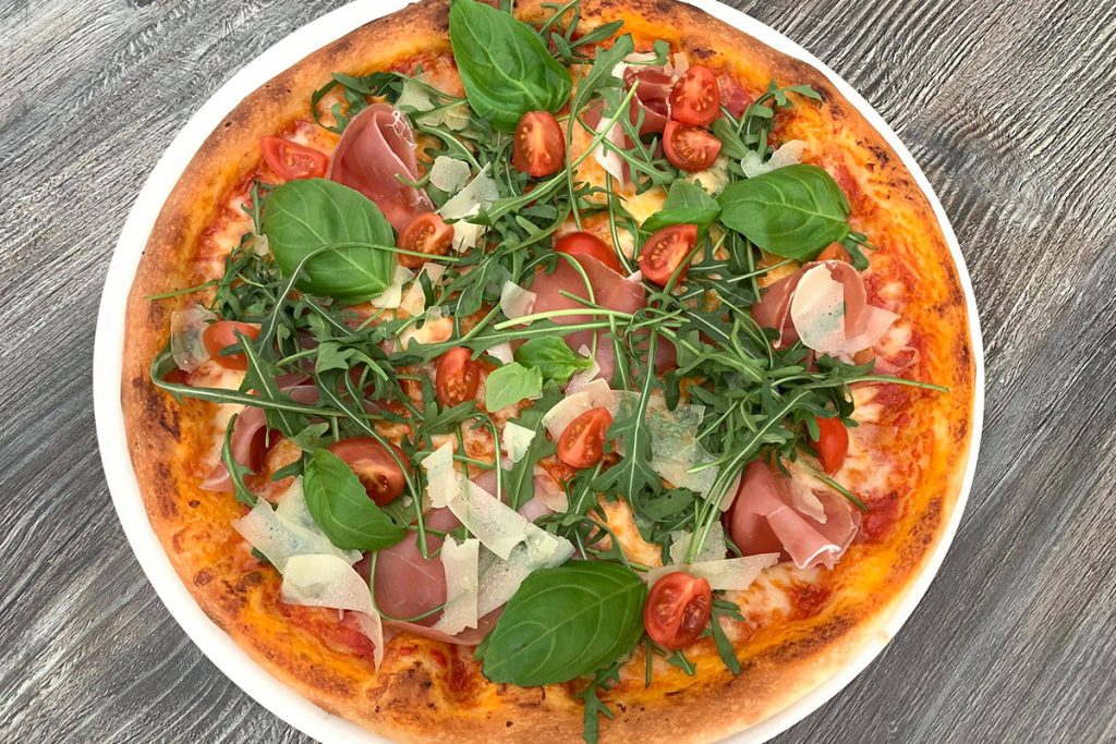 Pizzaszósz, mozzarella sajt, fokhagyma, friss paradicsom, bazsalikom, pármai sonka, rukkola, parmezán forgács