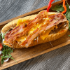 hotdog kifli, wimpi szósz, prémium frankfurti virsli, bacon, trappista sajt