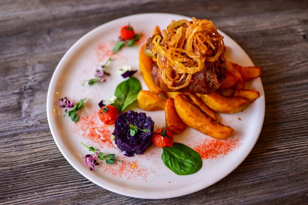 fűszeres steakburgonyával, párolt lilakáposztával