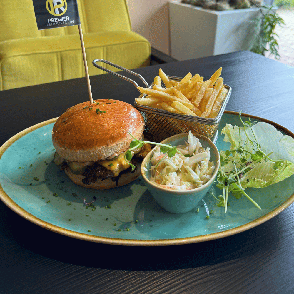házi kovászos burgonyás hamburgerzsemle, 2 db 80g-os 100% Hortobágyi Angus marhahúspogácsa, karamelizált hagyma, cheddar sajt, smash szósz, csemegeuborka